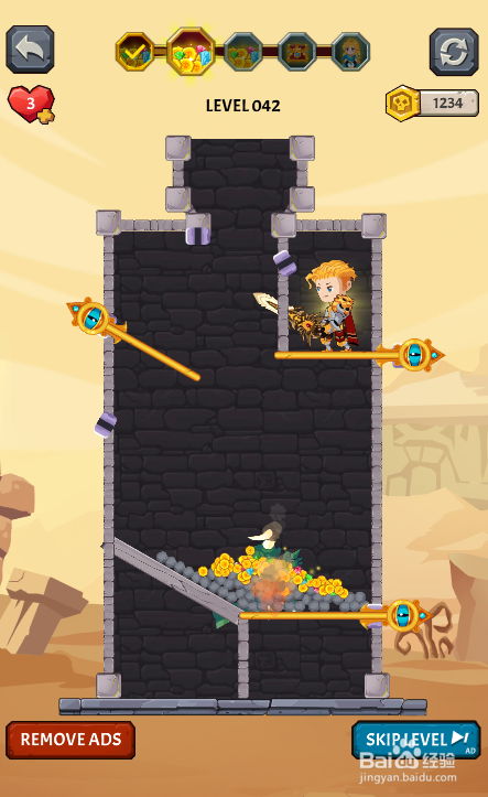 这个关卡的使命是得到黄金,熔岩在黄金下侧,内里共有六个拉针,环境如图。