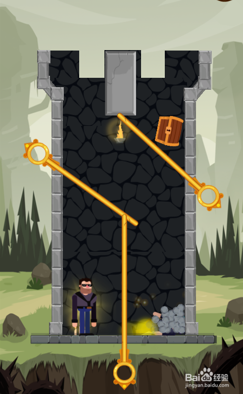 这个关卡的使命是得到宝箱,宝箱在右侧顶部,中年大叔站在左侧底部,匪徒站在中年大叔的右侧,环境如图。