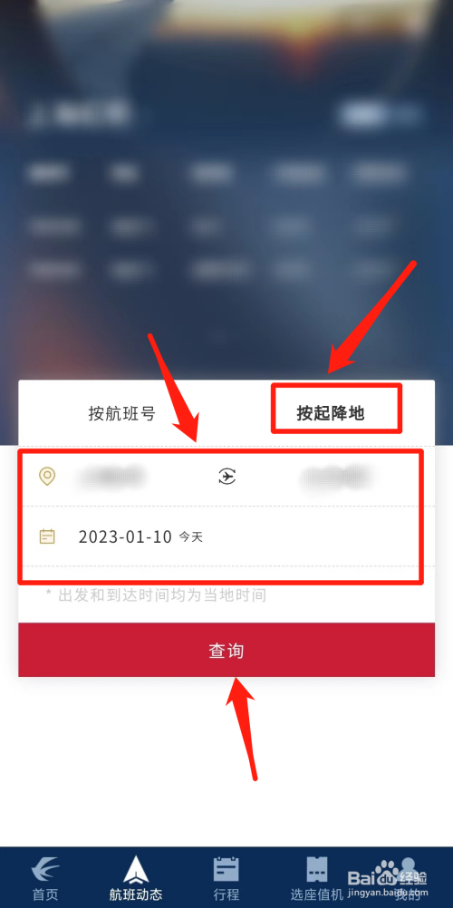 进入按起降地页面后,选择出发地、目的地、腾飞日期,点击【查询】。