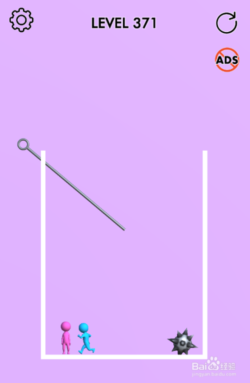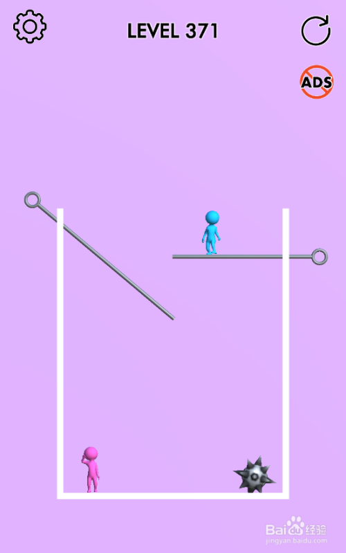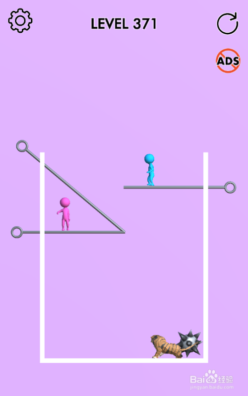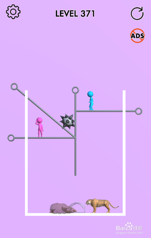 这一关小蓝人在山君上侧,棕熊在小粉人下侧,流星锤在小粉人右侧,大猩猩与捕兽夹在底部,内里共有六个拉针,环境如图。