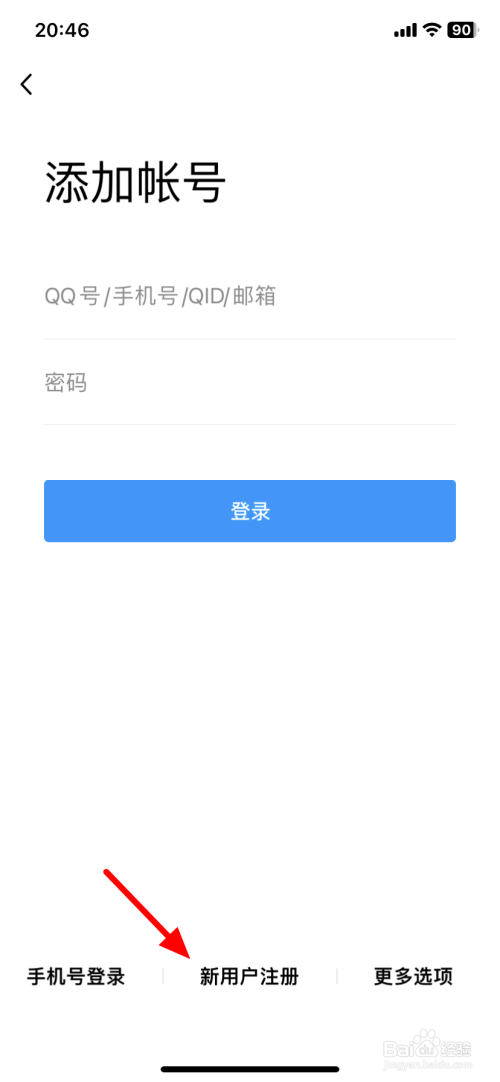 在添加帐号界面,点击新用户注册。
