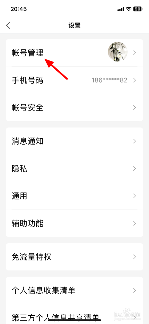 在设置界面,点击帐号办理。