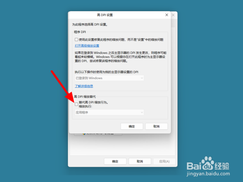 在高dpi设置界面,勾选【替换高DPI缩放举动】。
