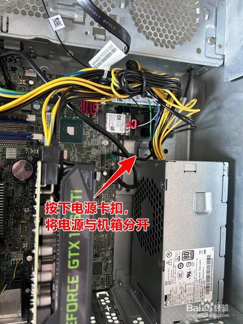 在机箱内按下电源卡扣,将电源与机箱分散。