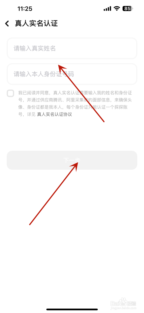进入真人实名认证的页面输入”基本信息“后选择”下一步“按钮;