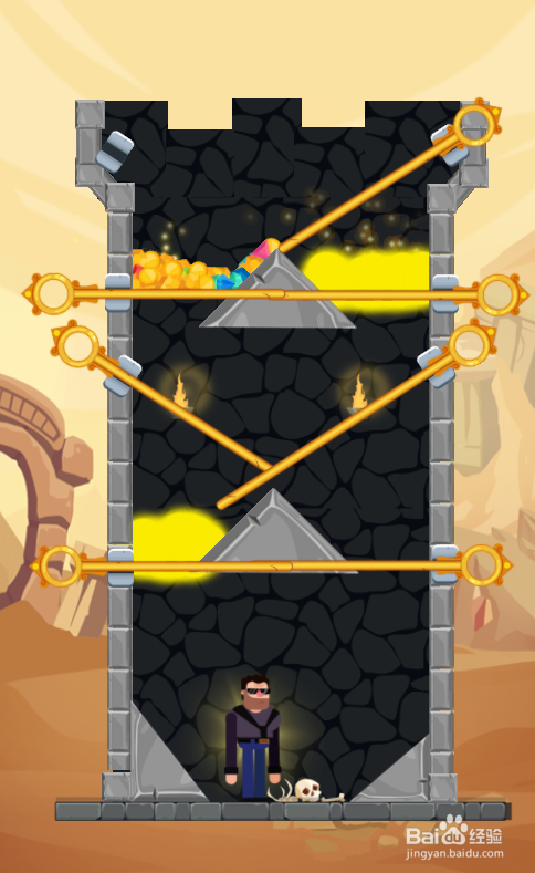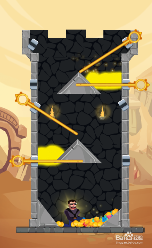 这个关卡内里有八个拉针,熔岩漫衍在宝藏的左下侧、右下侧,中年男子站在底部,环境如图。