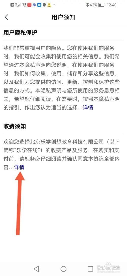 进入用户须知,然后在收用度须知下方点击【详情】。