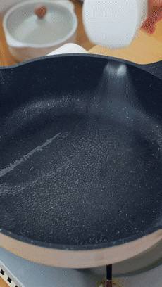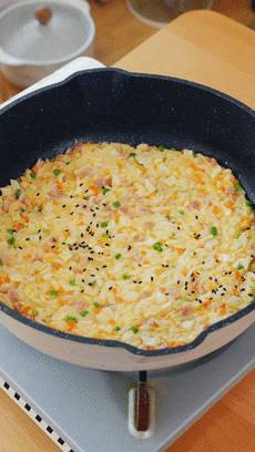 不粘锅喷油,将蛋液米饭糊倒入锅中,稍微整理整理,让米饭糊在锅里匀称地铺平。