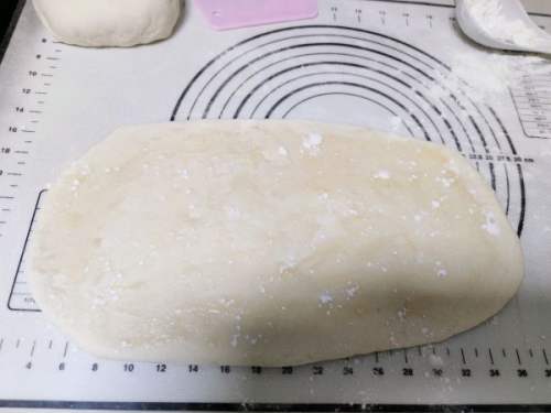 - 9擀发展方形,撒盐抹匀,擀几下,抹上油酥,撒面粉。