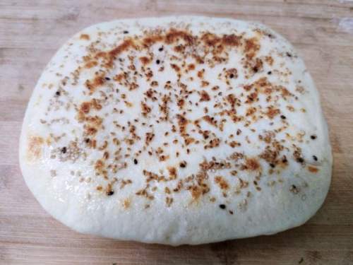 - 13用擀面杖正背面都按压薄一点,擀开,抹水,撒芝麻。