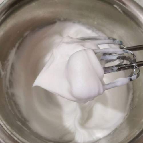 - 5用电动打蛋器打至湿性发泡,分次插手魔芋粉