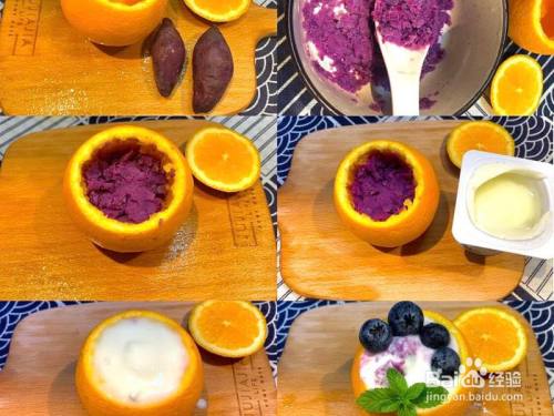 喷鼻橙紫薯酸奶 : 1.紫薯煮熟捣当作泥 2.放入筹办好的橙子外壳 3.铺上酸奶 4.用一点本身喜欢的生果或薄荷做装饰