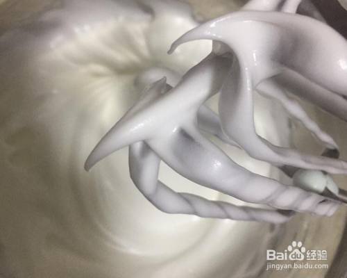 卵白分三次插手细砂糖,丁宁至湿性发泡即可。