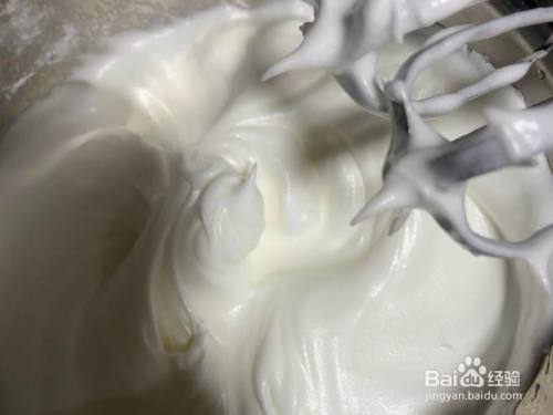 插手第三次白糖,开1档低速丁宁,(以免丁宁过甚)丁宁至打蛋器提起有小弯钩。
