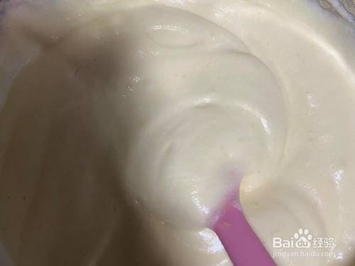 舀1/3的卵白霜到蛋黄糊中,画J字搅拌(即竖一刀翻起来)搅拌匀称。