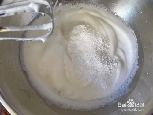 卵白高速丁宁当作泡沫状插手三分之一的糖,继续丁宁到糖都融化了再插手三分之一糖,继续丁宁到糖融化,最后三分之一糖插手10克玉米淀粉拌匀一路打。