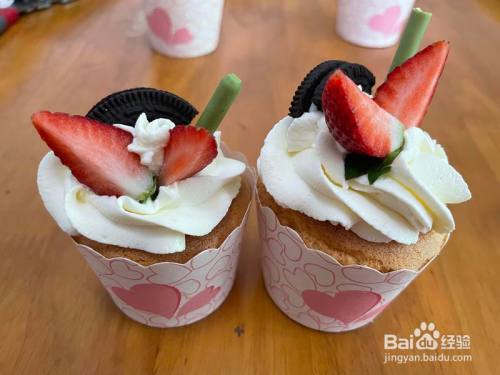 奶油丁宁后装入裱花袋,选喜欢的花嘴挤上一朵奶油花,摆上生果。