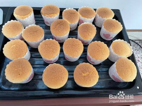 把捞匀的蛋黄糊倒入卵白盆中继续捞匀,此时预热烤箱,把蛋糕糊装入纸杯中。逐个震出气泡,排入烤盘,放入烤箱中基层130度烤30分钟,再把烤盘放中层150度热风烤10分钟。
