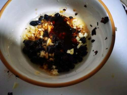 - 2蒜蓉和豆豉剁碎插手生抽、蚝油、老抽、料酒、白糖、花生油搅拌匀称。(蒜蓉剁得越碎越入味