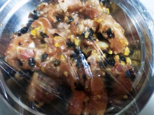 - 4把蒜蓉豆豉酱汁倒入排骨中,用手抓腌匀称,腌制十五分钟以上