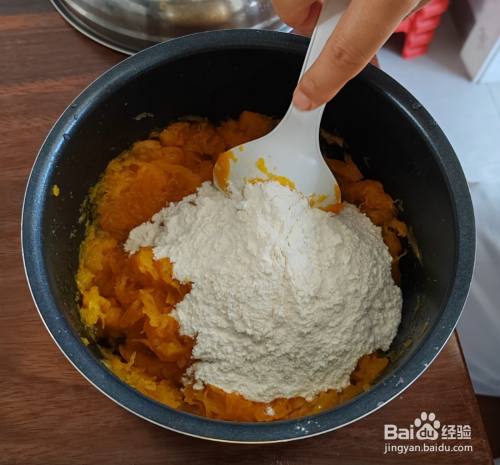 倒入适量面粉,与南瓜混淆揉搓。为了增长甜味,可以插手适量糖,最后揉当作团。