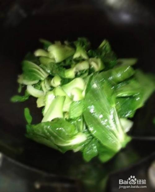 锅内放油,大火,油热后,倒入青菜比力硬的部门,爆炒。