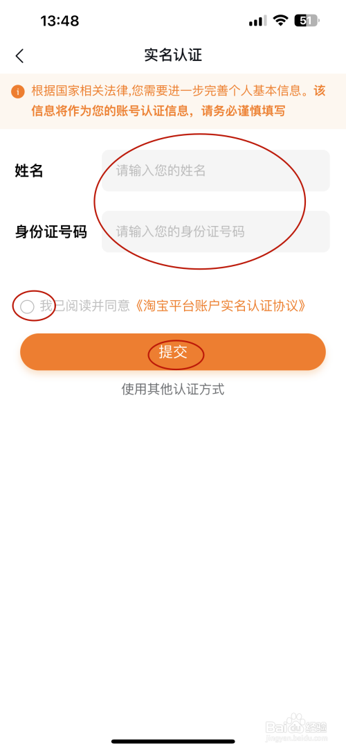 进入实名认证的页面输入【身份信息】后点击【提交】按钮;