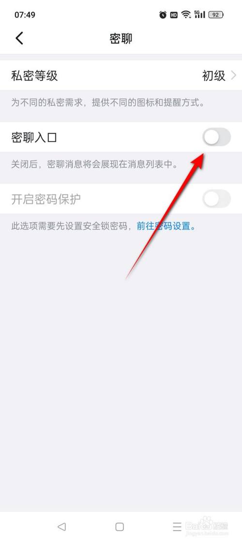 将“密聊进口”旁的小滑块点暗即可封闭。