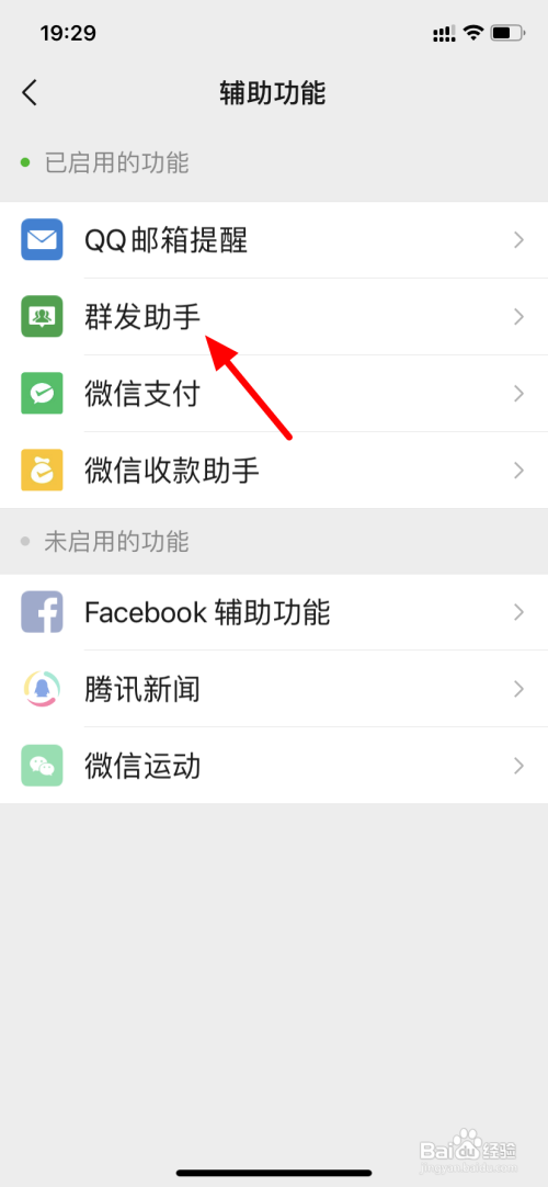 在辅助功效界面,点击群发助手。