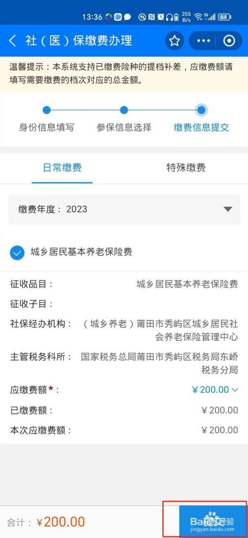 最后选择缴用度年度,点击提交即可交城乡住民养老保险