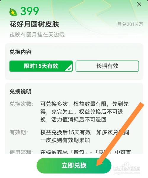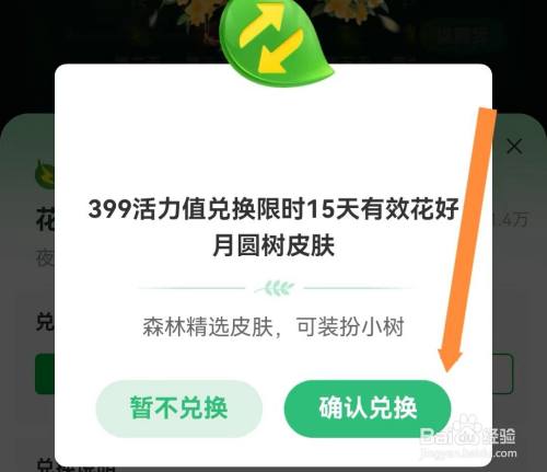 页面跳转后,点击【确认兑换】,如图所示,这样就完当作了用活力值兑换花好月圆树皮肤。