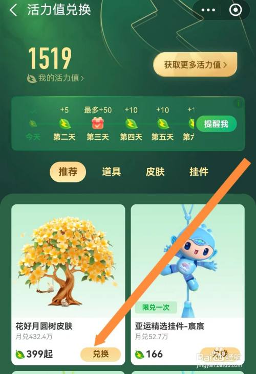 页面跳转到“活力值兑换”后,点击“花好月圆树皮肤”卡片右下方的【兑换】,如图所示。