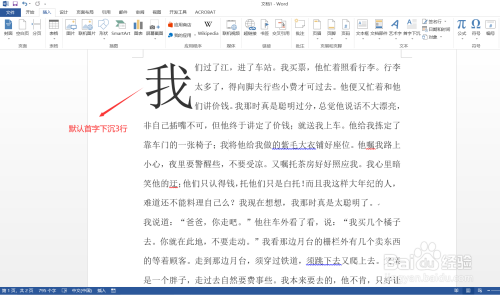 打开一个word文档,先全选含需要下沉字的段落(或选摘要下沉的字,或光标定在含下沉字的段落中),点击【插入】,在“文本”栏中点击【首字下沉】—【下沉】,则段落首字下沉设置乐成,默认下沉3行。