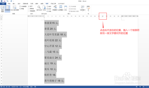 在上方标尺合适的位置点击一下,插入一个制表符(就是另一排文字要移动到的位置)。