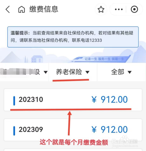 点进去之后,我们就看到了每个月本身缴纳养老保险的金额了,如下图,10月份缴纳了912