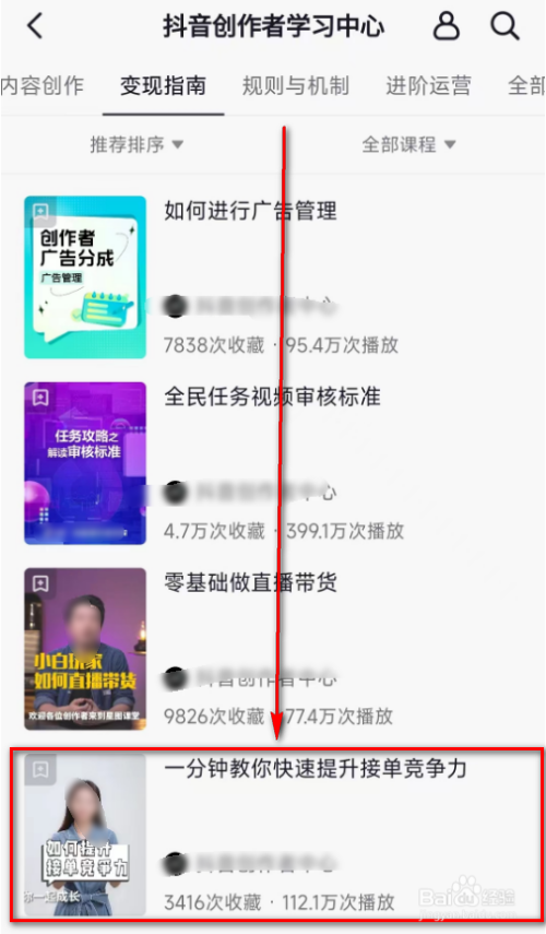 5.进入到抖音创作者中间页面后,点击: 进修中间。