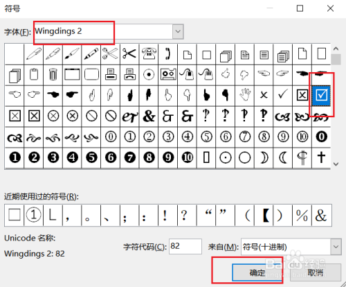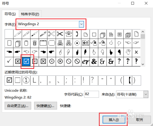 ②将字体切换为Wingdings 2,找到带√方框,插入。