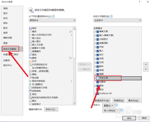 ②切换到【自界说功效区】标签页,在右侧勾选【开发东西】,点击确定。