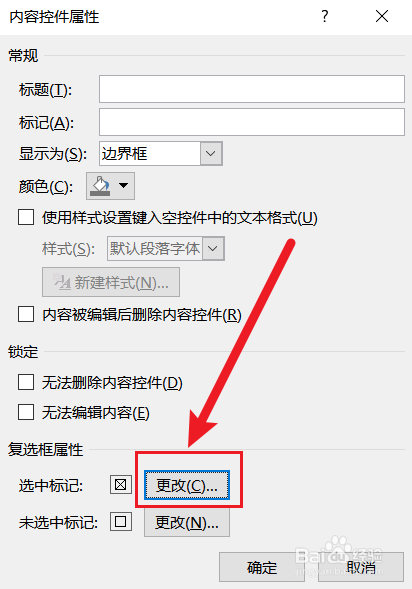 ④选中复选框,点击【开发东西】-【控诉件】中的【属性】,在窗口中,点击【复选框属性】-【选中标志】后的【更改】按钮。