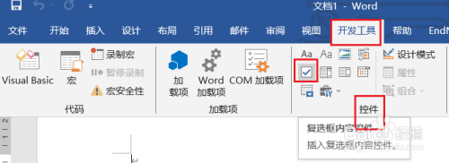 ③在菜单【开发东西】-【控诉件】中找到【复选框】,点击插入。