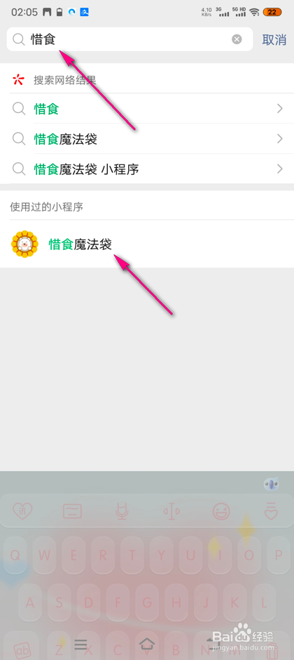 输入要害词,点击对应的小程序按钮。