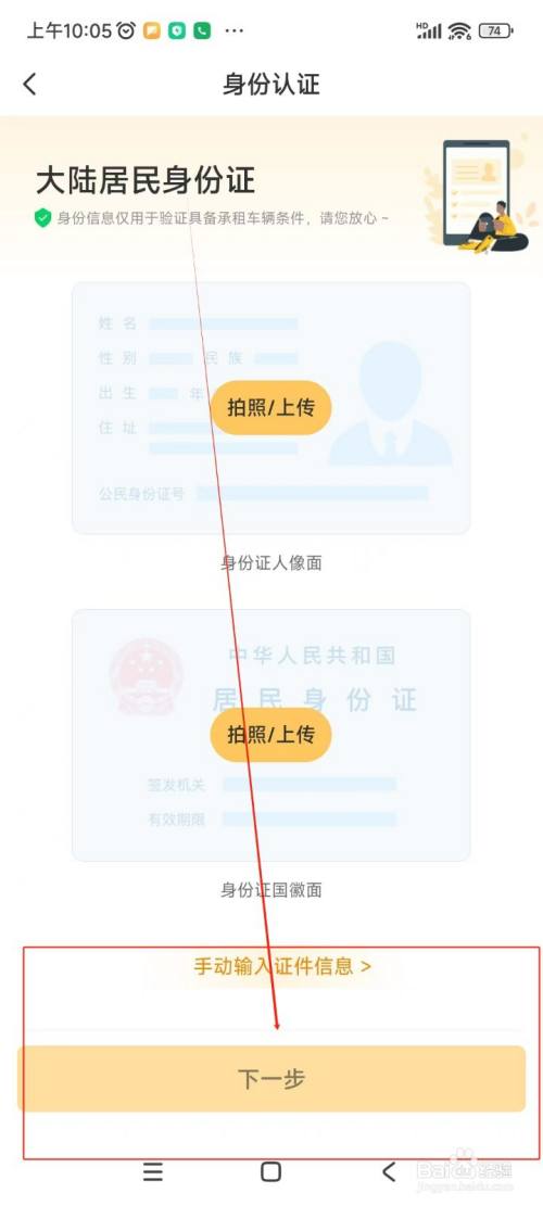 选择“大陆住民身份证”后,并在新界面中上传身份证照片后,点击底部的“下一步”