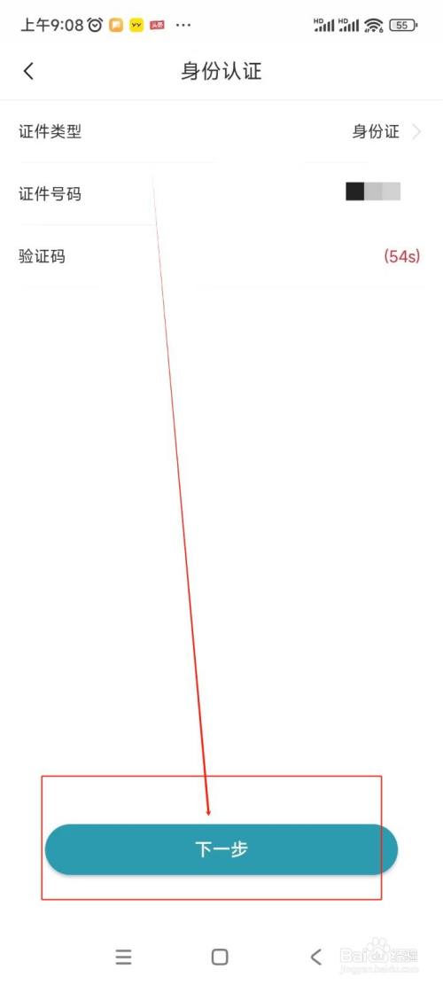 在身份认证界面中,输入证件号和验证码后,点击“下一步”