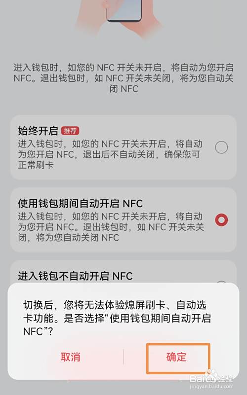 打开如下图界面,点击勾选利用钱包时期主动开启NFC选项,然后点击下方简直定按钮。