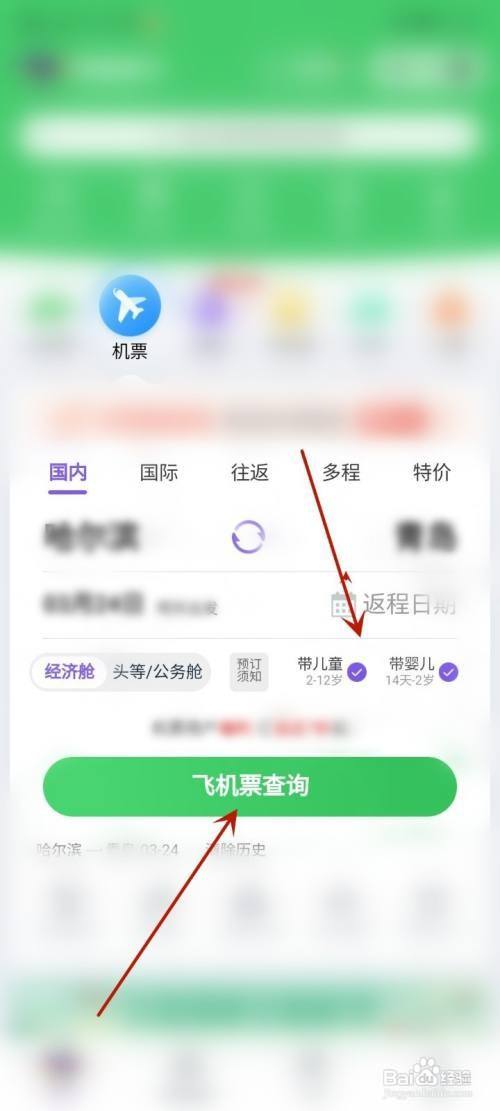 首先打开机票页面,填写出发地以及目的地,勾选带儿童(2-12岁)或者带婴儿(14天-2岁),然后点击飞机票查询功效。