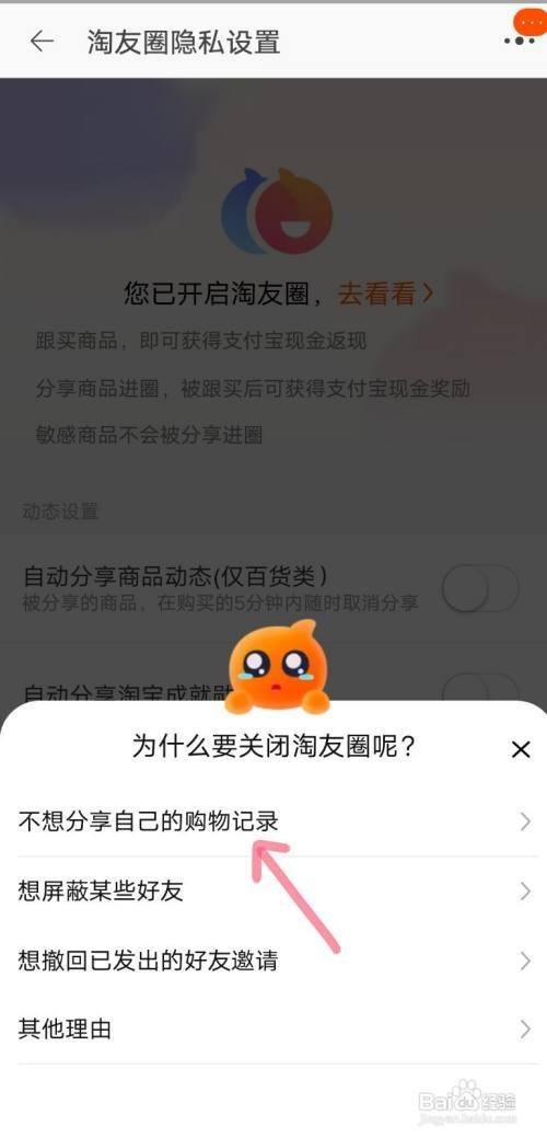 呈现理由窗口,点击"不想分享本身的购物记载"。