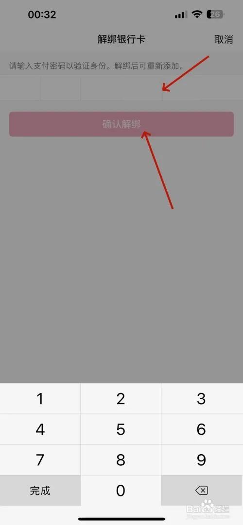 打开解绑银行卡的界面输入"支付密码"后点击"确认解绑"按钮。