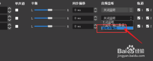 找到媒体源对应的"音频监听"列,点击下拉列表选择"监听并输出"