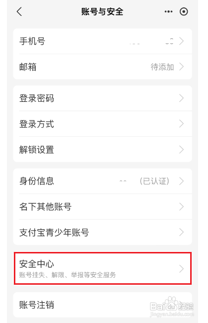 进入账户与安全界面,点击安全中间进入。
