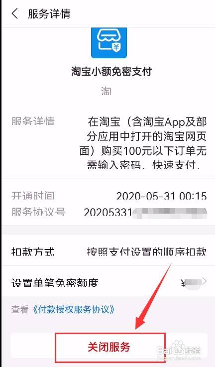 最后点击"封闭办事",就可以封闭小额免密支付办事了。